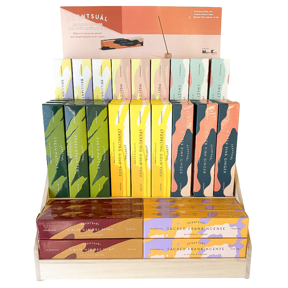 SCENTSUAL Unit Set, 12 packages each of all 8 fragrances with wooden display rack.